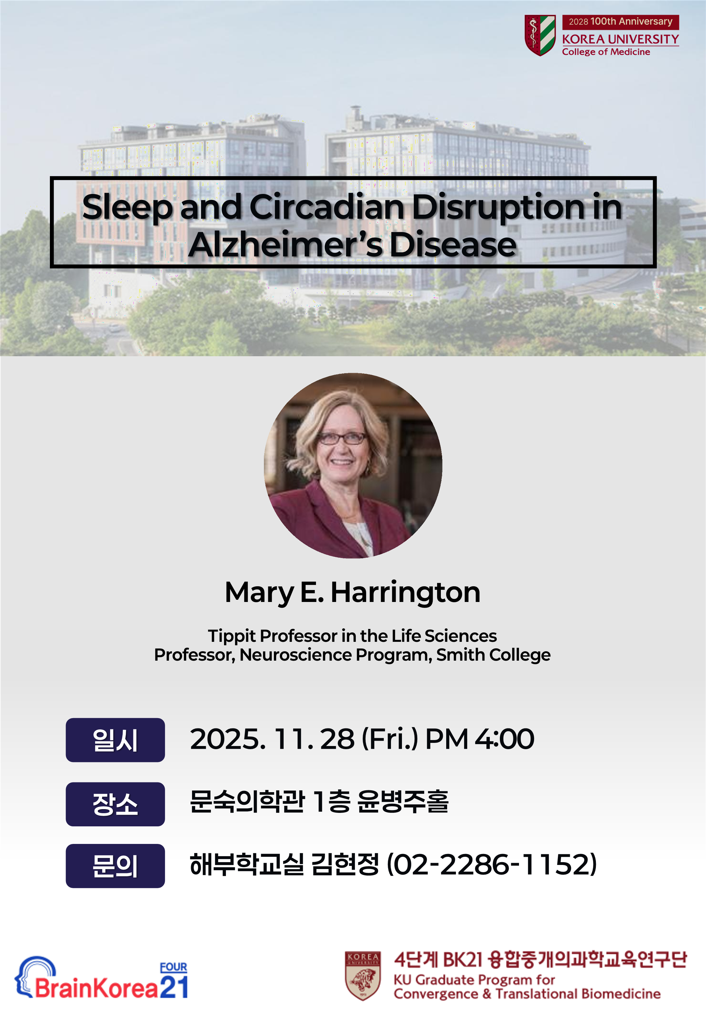 | 제목 | [특별세미나] 11/28일(금) 오후 4시_Mary E. Harrington Professor / Neuroscience Program, Smith College |