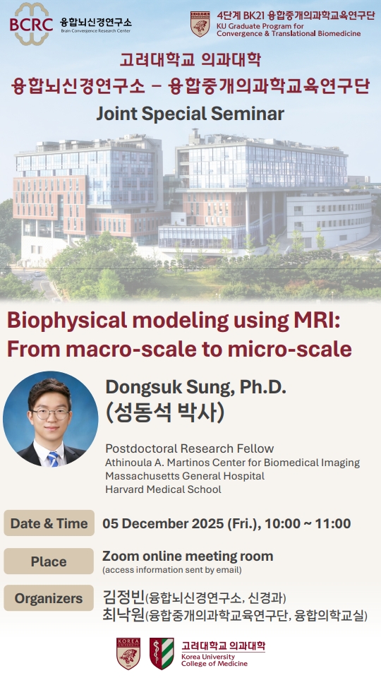 | 제목 | [특별세미나] 12/5일(금) 오전 10시_Dongsuk Sung, Ph.D. /Postdoctoral Research Fellow_ Harvard Medical School |