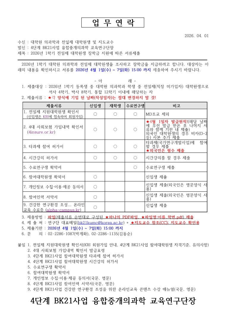 | 제목 | 2026년 1학기 전일제 대학원생 장학금 지원에 따른 서류제출_참여대학원생 |